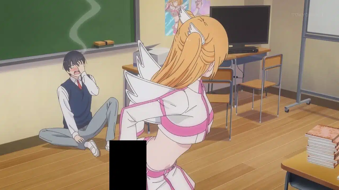 Después de estar completamente cambiada, Amano Ririsa le muestra al protagonista masculino cómo se ve, incluyendo la ropa interior. Primero, enseña la parte delantera y luego se voltea para mostrar su “perro”, lo que hace que Masamune Okumura se desmaye inmediatamente por los nervios.
