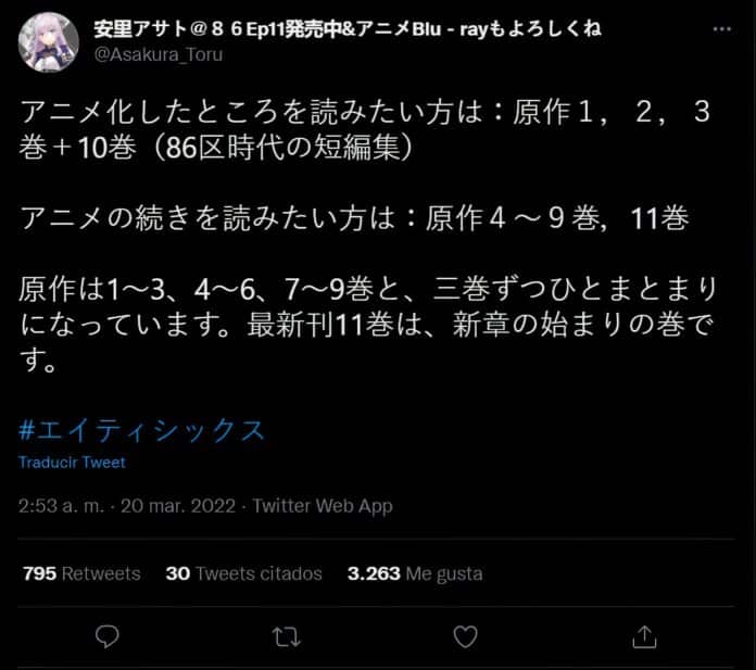 En su Twitter personal, Asato-sensei explicó a sus seguidores el cómo se agrupan los arcos de la serie, y con esta división, la autora buscó facilitar la lectura a los fanáticos de la franquicia 86: Eighty Six que quieren continuar con la historia en donde finalizó el anime. Además, Asato-sensei dio a conocer que la historia de la novela ligera se encuentra en el 4to Arco, y nos reveló que la primera temporada del Anime adaptó únicamente el primer arco de la novela ligera, el cual dura 3 Volúmenes.