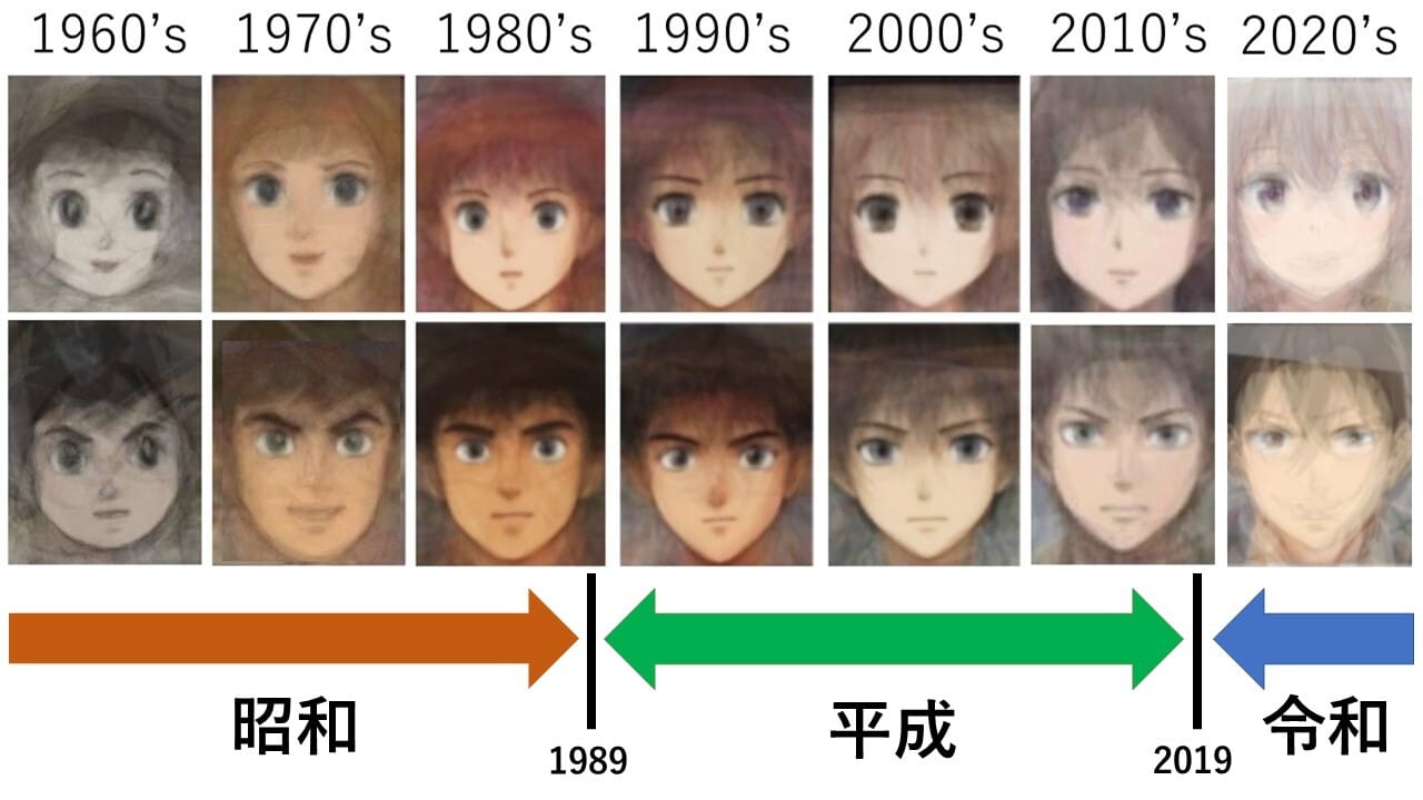Como podemos observar, la comparativa inicia en la década de los 60 ‘s, teniendo como predominancia un rasgo ovalado en el rostro el cual se fue volviendo algo más triangular al pasar el tiempo. A medida que pasaba el tiempo los colores pasteles comenzaron a predominar, las pupilas dejan de ser tan marcadas y podemos comenzar a ver el iris con pequeños reflejos, así como unas pestañas más notorias. Este periodo que termina en 1989 es conocido como la era Showa, donde a su finalización ya se podía observar un claro cambio en el diseño.