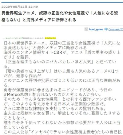 Unos de los temas que menciona el articulo, es el polemico inicio del anime y la falsa denuncia de violación que desencadenó en la desgracia de Naofumi. Mencionando que lo visto va en desacuerdo con lo visto en el movimiento #MeToo, por lo que los occidentales comenzaron a criticar el anime, mientras que en Japón no se le dio tanta importancia.