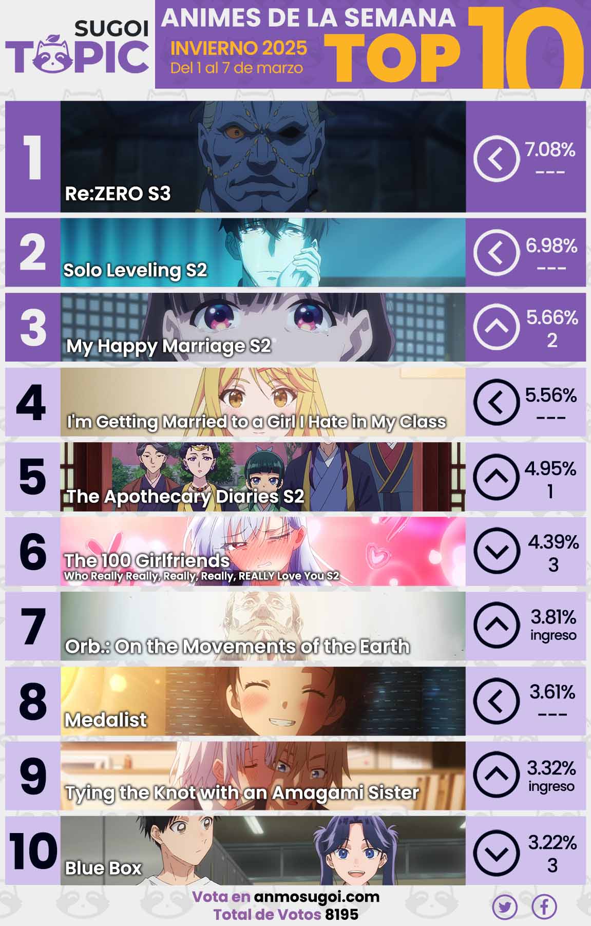 La tercera temporada de Re:ZERO – Starting Life in Another World mantiene la primera posición esta semana, seguido de la segunda temporada de SOLO LEVELING y la segunda temporada de My Happy Marriage.