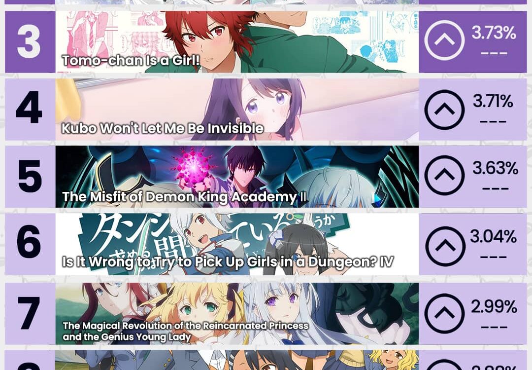 The Angel Next Door Spoils Me Rotten, NieR Automata Ver1.1a y Tomo-chan Is a Girl! se ubican en el podio.