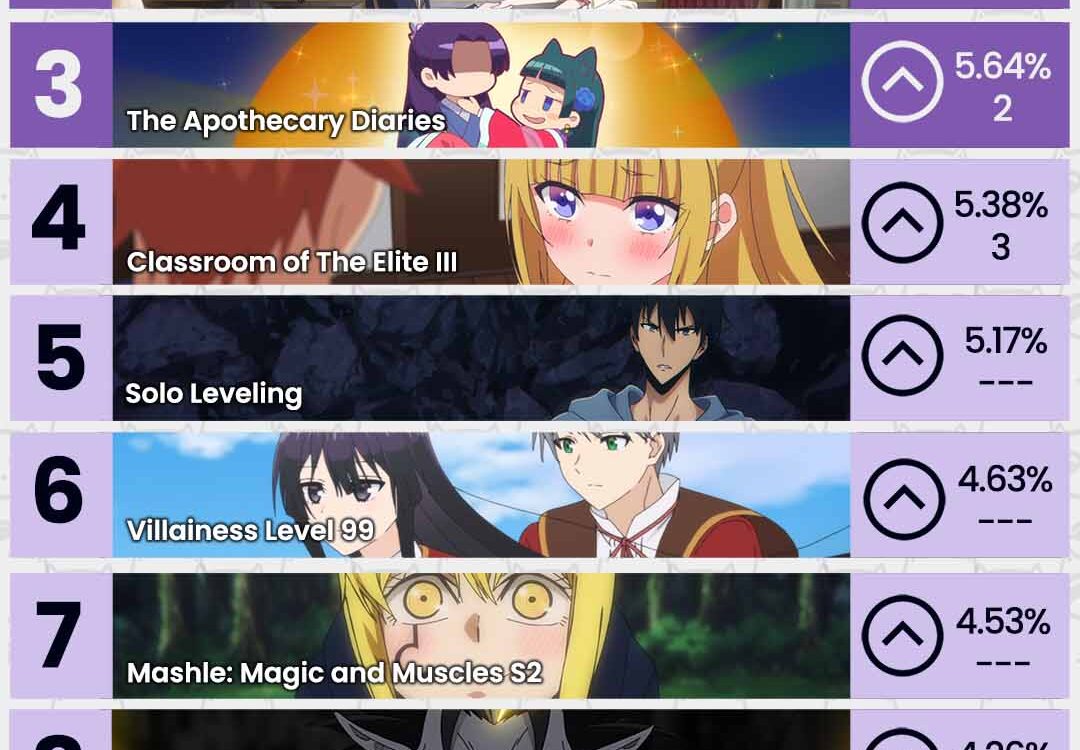 Los animes The Dangers in My Heart S2, 7th Time Loop y The Apothecary Diaries se ubican en el podio esta semana.