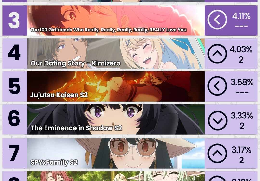 Los animes Frieren: Beyond Journey’s End , The Apothecary Diaries y The 100 Girlfriends Who Really, Really, Really, Really, REALLY Love You, se ubican en el podio esta semana.