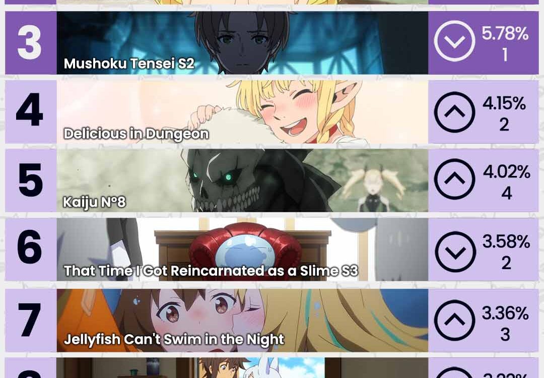 Los animes Date A Live V, KONOSUBA -God’s Blessing on This Wonderful World! 3 y Mushoku Tensei Jobless Reincarnation Season 2 se ubican en el podio esta semana.