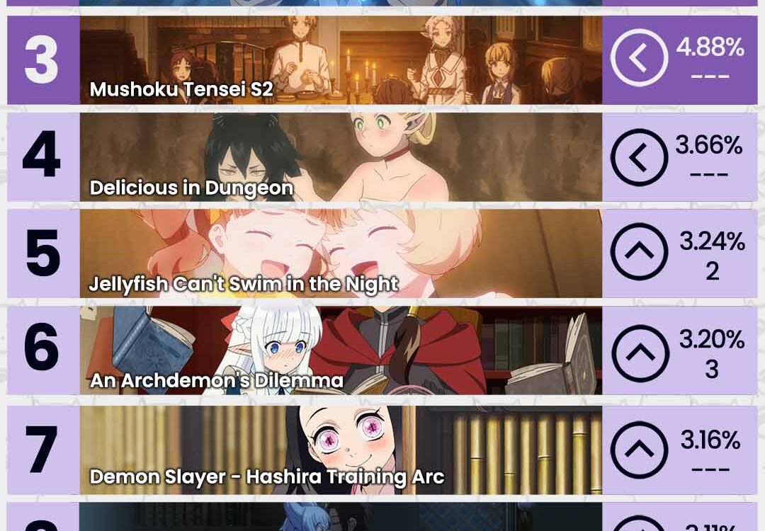 Los animes Date A Live V, KONOSUBA -God’s Blessing on This Wonderful World! 3 y Mushoku Tensei Jobless Reincarnation Season 2 se ubican en el podio esta semana.