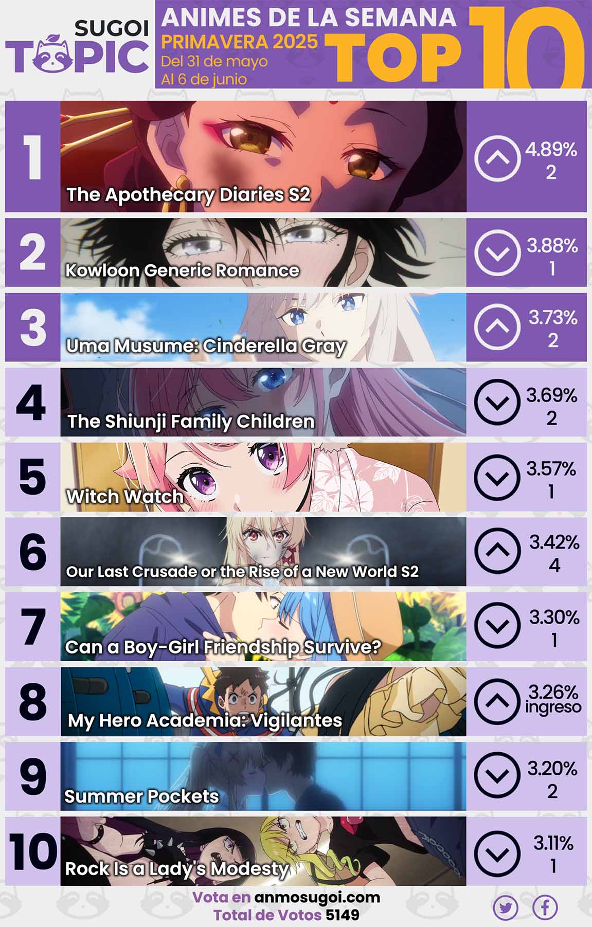 La segunda temporada del anime THE APOTHECARY DIARIES se coloca en primera posiciรณn esta semana, seguido Kowloon Generic Romance y Uma Musume: Cinderella Gray.
