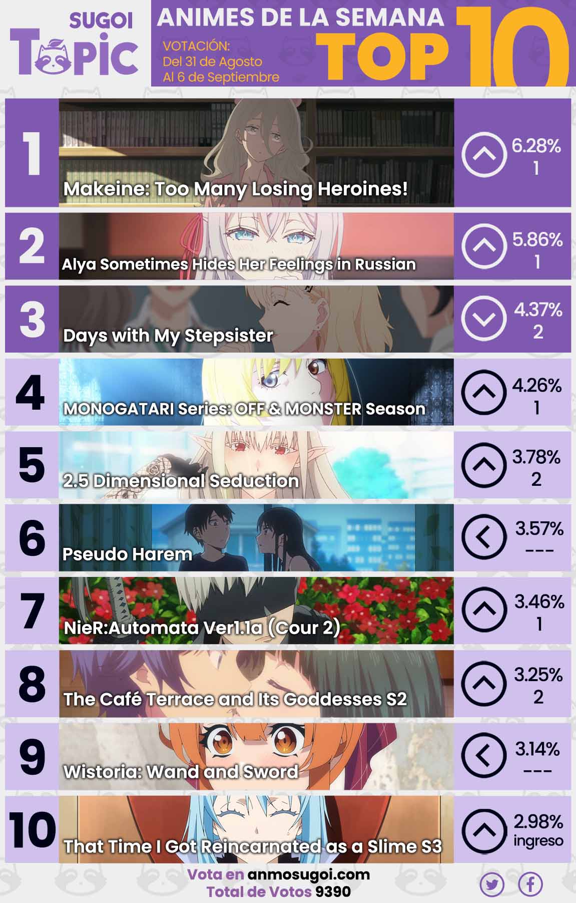 El anime MAKEINE: Too Many Losing Heroines! se ubica en primera posición, seguido Alya Sometimes Hides Her Feelings in Russian y Days with My Stepsister.