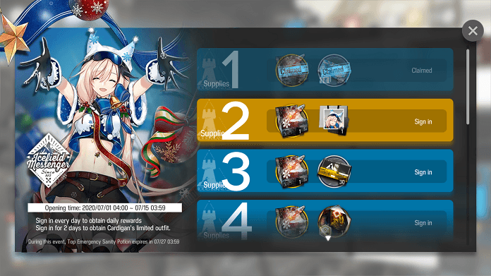 Duraciรณn: 30 de junio a 14 de julio – Se pueden conseguir paquetes pequeรฑos de Sanity (10 Sanity) y cajas pequeรฑas de suplementos. Ademas, los nuevos operadores que llegan con este episodio recibirรกn un 50% mas de afinidad en combate, Blaze, Ambriel y GreyThroat.