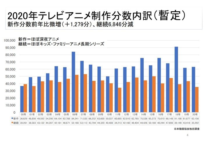La Asociación de Animaciones Japonesas (AJA) publicó información preliminar del Informe de la industria del anime 2020. El informe encontró que hubo un total de 98,448 minutos de anime para televisión producido en 2020, 6.5% menos que los 105,294 de 2019, convirtiéndose en la segunda reducción consecutiva desde 2018.