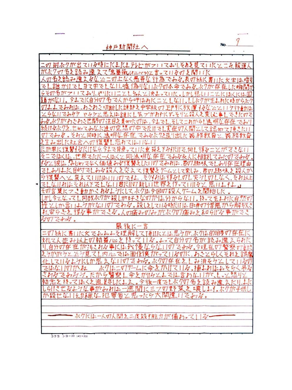 Dentro de la boca de ese desafortunado estudiante llamado Jun Hase que encontró la muerte a sus 11 años de edad, se encontraba una nota escrita con birome roja en donde el asesino había escrito su seudónimo como Seito Sakakibara (¿Recuerdan el apellido?).