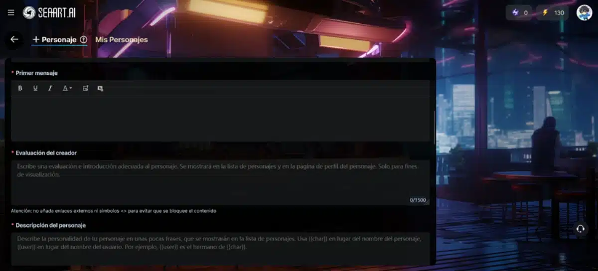 Lo siguiente que deberás hacer es redactar el mensaje inicial del personaje a los usuarios. Esto es muy importante porque consiste en su carta de presentación. También deberás redactar la evaluación el personaje, que funciona como una introducción para su página, pero que no se utiliza para que la IA le dé su personalidad.