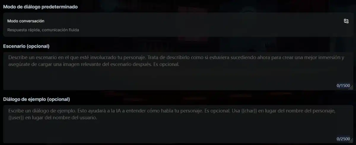 Las otras dos opciones –‘Escenario’ y ‘Ejemplo de diálogo’ son simplemente para completar un poco más el contexto del personaje. El escenario define dónde se encuentra el personaje ahora, en contraste con su contexto histórico más general. Y, si quieres, también puedes crear un ejemplo de diálogo para que la IA tenga más referencias sobre cómo debe expresarse el personaje.