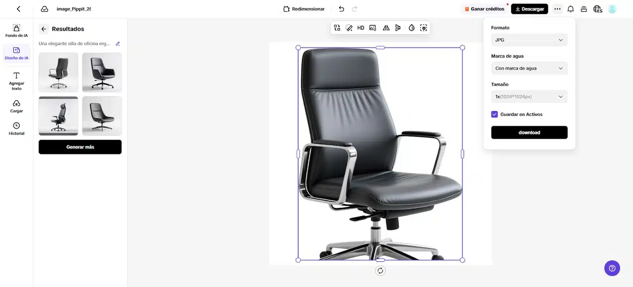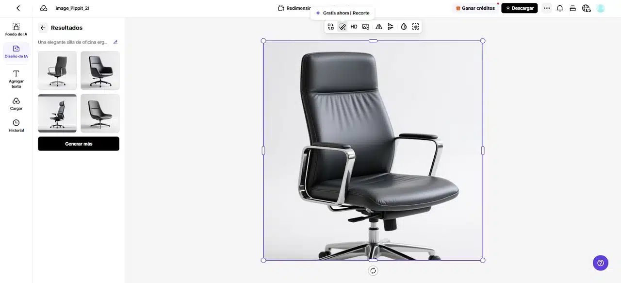 La IA te dará 4 variaciones. Elige la que funcione para tu video. Si ninguna encaja, haz clic en generar más. Una vez que se cargue en el lienzo, haz clic en la imagen y luego selecciona «Recorte» en la parte superior.