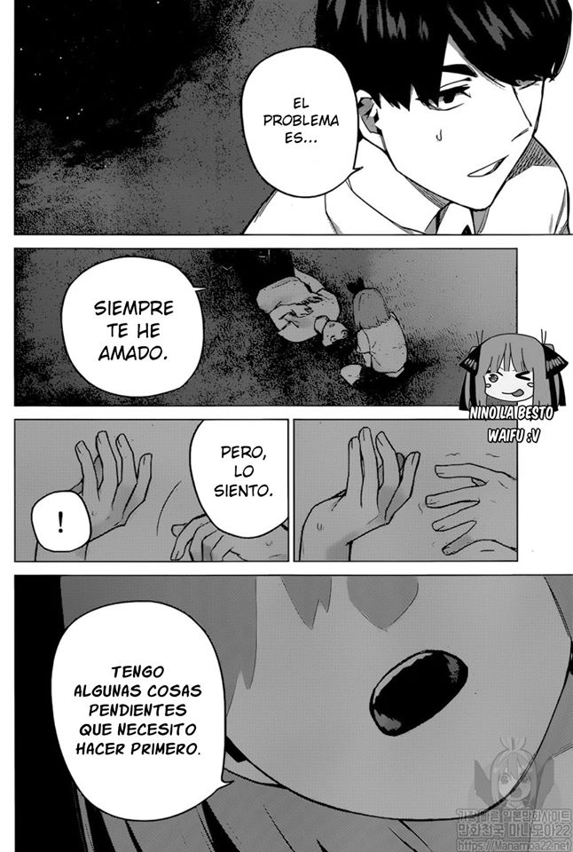 En las siguientes páginas se nos muestra una discusión, debido a que Nino está enojada con Yotsuba, ya que ella amaba a Fuutarou, y aun así, ella se » lo robo» y «tuvo el atrevimiento» de pedirle disculpas.