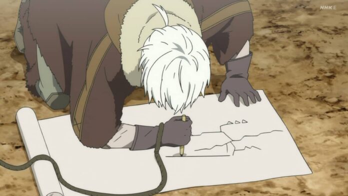Pioran empieza a hacer un bosquejo del mapa y eso llama la atención de Inmo haciendo que le arrebate el pergamino y el pincel para poder dibujar.