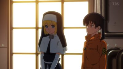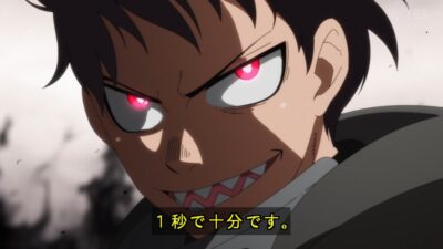 Por otro lado la animación de la lamentablemente corta pelea de Shinra contra Tempe, en donde se vio el otro lado de la fuerza de Shinra, la cual aun no está perfeccionada completamente y aun depende demasiado de otra persona para que pueda sacar todo su potencial, personalmente espero que pronto Shinra ya pueda sacar esta fuerza pero de manera independiente, o sino el anime se metería en un bucle que lo volvería bastante aburrido y predecible, cosa que no me gustaría que pase.