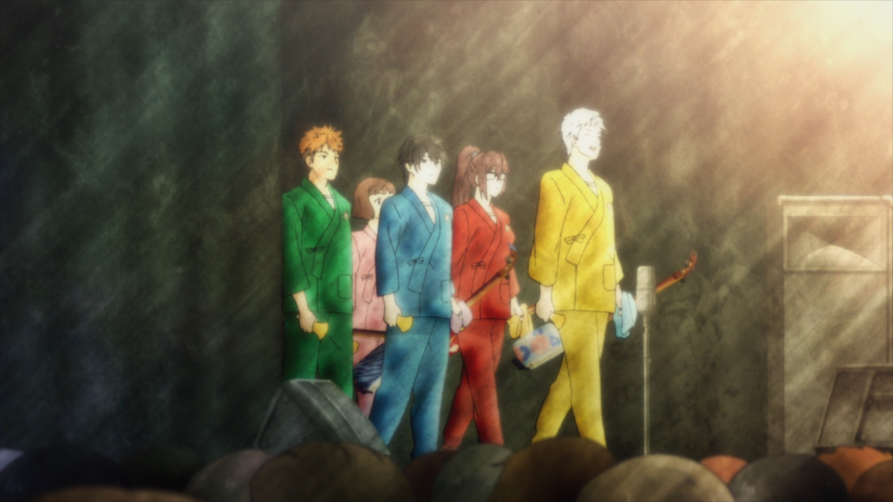 Mientras tanto, el resto de participantes ha comenzado a hacer sus presentaciones. Dentro de los otros grupos hay algunos que pasan sin pena ni gloria, pero hay otros que consiguen llamar la atención. Debido a esto, el club comienza a sentirse nervioso al ver que el nivel está siendo alto, pero el comportamiento de Setsu no ayuda.