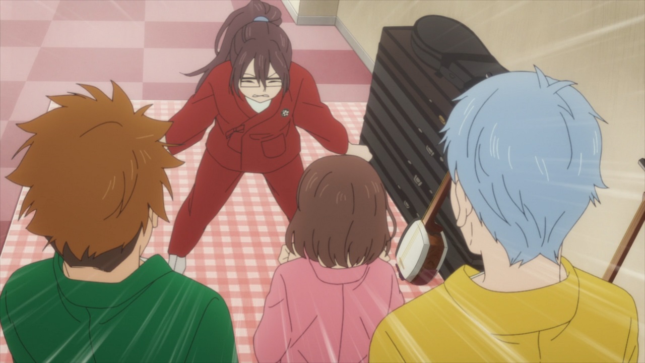 Me hubiera gustado que mostraran más el vínculo musical de los personajes tanto con el instrumento cómo con el propio género. En su lugar sólo se muestran sus vínculos personales, lo cual sigue dejando descolocado al shamisen, y pierde la posibilidad de explorarlo más a fondo.