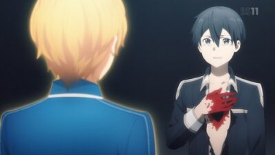 Empezamos este capítulo con un vista al interior de Kirito. En los primeros minutos vemos como sigue la vida de un escolar con los personajes del proyecto Alicization, Alice y Eugeo, entrelazados en sus recuerdos. Llegado a un punto en su viaje donde Kirito observa a su primer grupo en SAO, los Gatos Negros Iluminados por la Luna, específicamente a Sachi. Es ahí donde empieza a recordar y a empezar el pequeño viaje dentro por sus momentos vividos en SAO.