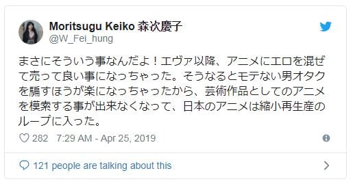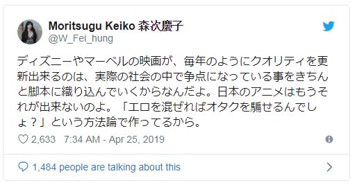 “La calidad de las películas de Disney y Marvel mejora cada año, y la razón por la cual se debe es que los problemas sociales actuales están presentes en sus guiones. La animación japonesa se ha vuelto incapaz de hacer eso. La metodología para hacer anime es «Mientras pongamos algo sexy, podemos engañar al otaku para que lo compre, ¿no?»