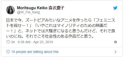 «En estos días, si hicieras una película como Zootopia en Japón, creo que la gente se pondría nerviosa al respecto y diría cosas como ‘¡Maten a las feministas!’ y ‘Espera, esta película solo fue hecha para complacer a las minorías’. Pero no hay nada de malo en que eso suceda. Eso demuestra que una película tiene relevancia social ”.