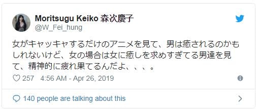 «Creo que los hombres probablemente se engañan al ver un anime que trata de chicas que se ríen y gritan, pero cuando las mujeres miran a los hombres que desean que las mujeres los reconforten, es psicológicamente agotador».