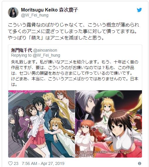 No es solo el contenido sexual explícito altera a Moritsugu. En otro tweet, expresó sus sentimientos sobre «moe», después de que otro usuario de Twitter mencionara su odio hacia el anime Sekirei .