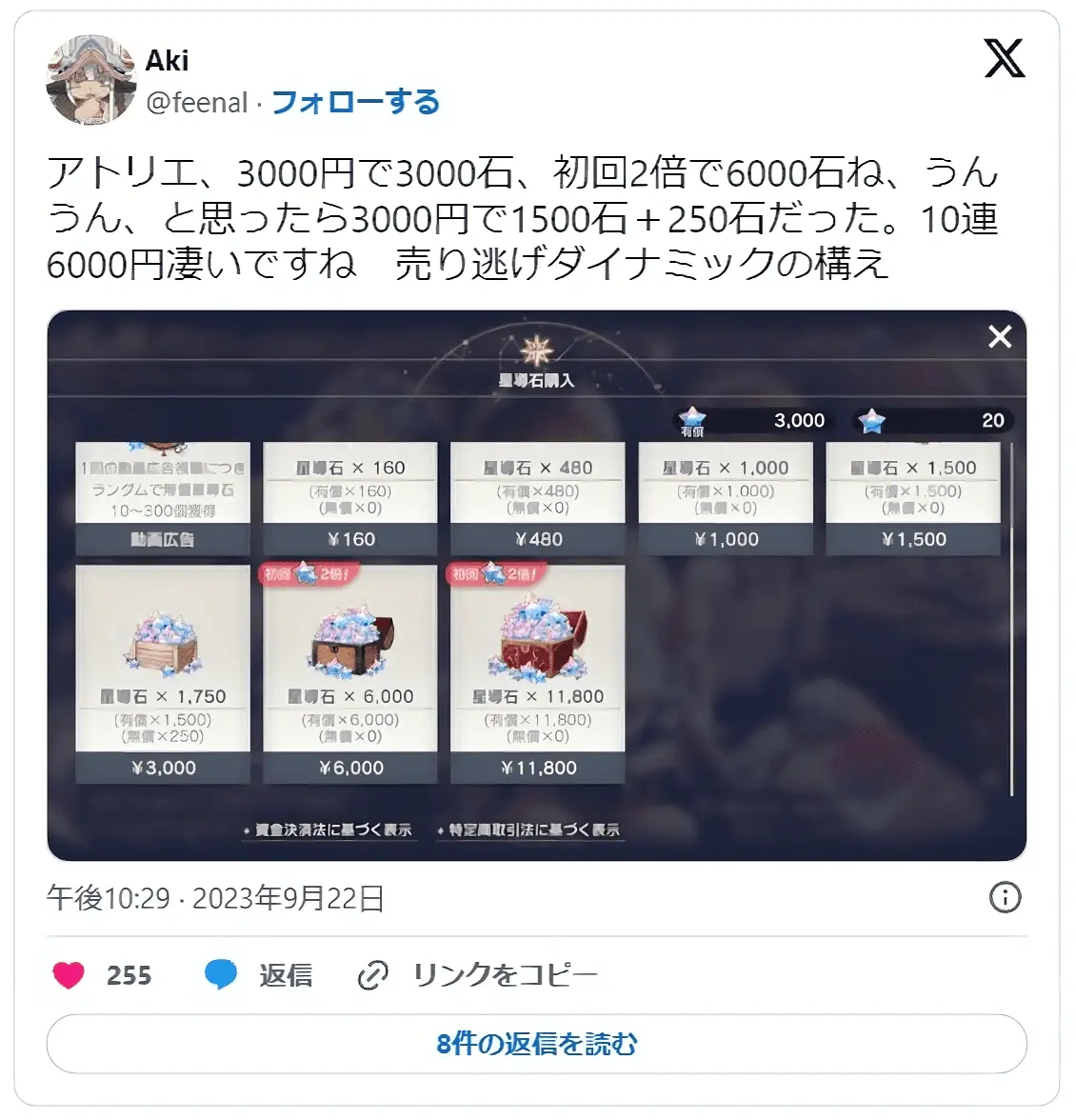 «Entonces, para el Atelier, pensé que eran 3,000 gemas por 3,000 yenes y el doble de 6,000 gemas por primera vez, ¿verdad?, pero no el precio real es de 3,000 yenes por 1,500 gemas + 250 gemas. Y lo que es peor, un rollo de diez por 6.000 yenes es una locura. Habla de explotación».