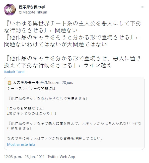 Pero las cosas no terminaron aquí, pues resultó que los autores de Tensei Shitara Slime Datta Ken y Mushoku Tensei dieron también su opinión acerca de esto. Este último realizó una publicación en su cuenta oficial de Twitter respondiendo a otro usuario el cual mencionaba que uno de los problemas de Cheat Slayer es que utilizo personajes de otras obras de forma muy evidente, haciéndolos comportarse de una forma vil e impensable para sus contrapartes originales.