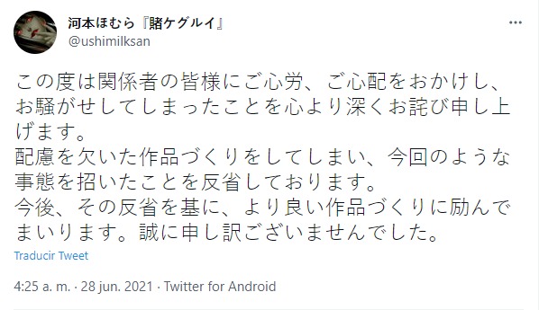 Ante toda la polémica suscitada Homura Kawamoto decidió hacer una declaración pública en su cuenta de Twitter disculpándose.