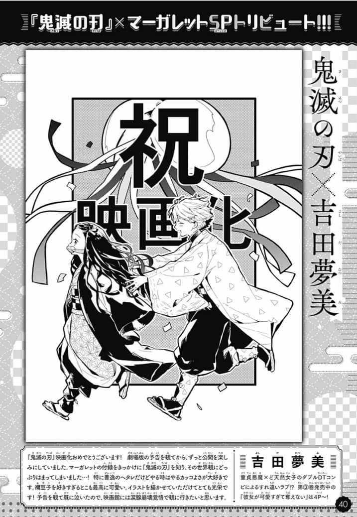 Además, la revista publicó una entrevista con el seiyuu Natsuki Hanae (voz de Tanjiro Kamado) y el seiyuu Satoshi Hino (voz de Kyojuro Rengoku) por su participación en la película, que se estrenará en cines de Japón el 16 de octubre. En la entrevista, ambos seiyuus hablaron sobre el personaje que les gustaría ser en un manga shoujo; Hanae dijo que le gustaría ser el tipo que parece un idiota a primera vista pero que tiene un corazón de oro, mientras que Hino dijo que le gustaría ser un tipo casi calvo que va a la escuela de la protagonista.