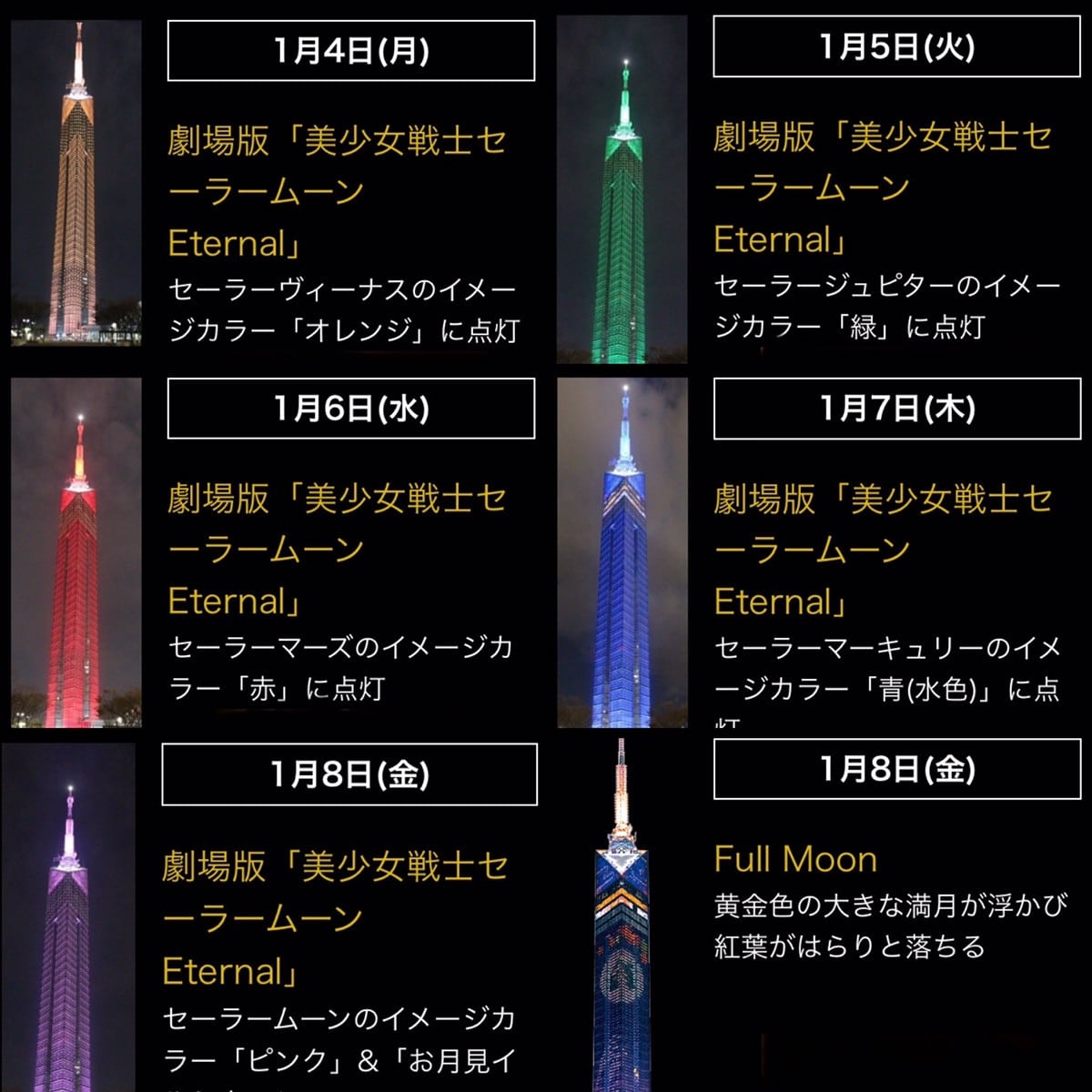 Tras una larga espera, la primera de dos partes del proyecto cinematografico Bishoujo Senshi Sailor Moon Eternal harรก su debut este viernes en Japรณn, debido a esto y con motivo de colaboraciรณn, la torre de Fukuoka en Japรณn ha estado encendiendo sus luces y cambiรกndolas de color cada dรญa desde el comienzo de la colaboraciรณn.