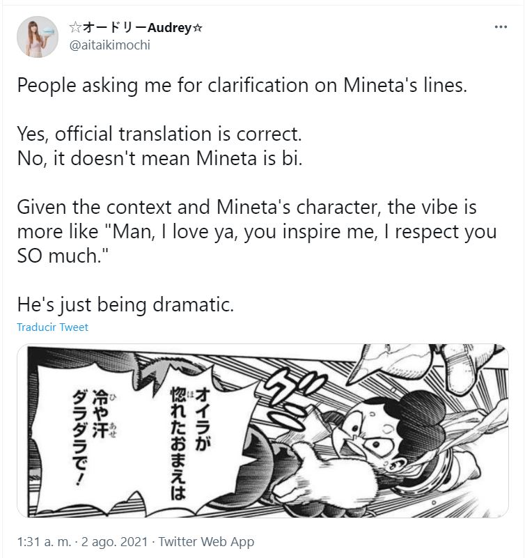 La gente me pide aclaraciones sobre las líneas de Mineta. Sí, la traducción oficial es correcta. No, eso no significa que Mineta sea bi. Dado el contexto y el personaje de Mineta, la vibra es más como «Hombre, te amo, me inspiras, te respeto mucho». Solo está siendo dramático.