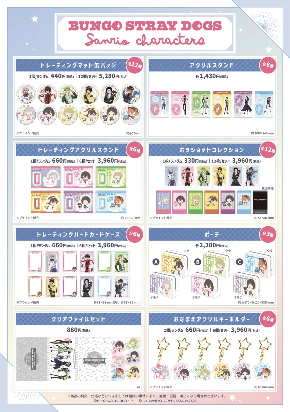 Entre los artículos de esta fabulosa colaboración hay botones metálicos, geniales, figuras de acrílico, fotos al estilo polaroid, tarjetas rígidas, útiles monederos, y llaveros de acrílico. Absolutamente, todos los productos de esta colaboración entre Bungou Stray Dogs y Sanrio tiene los diseños presentados en los visuales y están tan hermosos, que quisieras poder coleccionarlos todos.