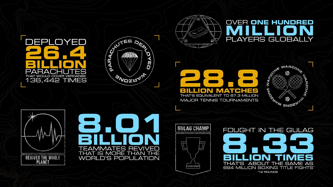 Pero ademรกs, Activision revelรณ una infografรญa con algunas estadรญsticas del juego. Dentro de รฉl, han habido mรกs de 28.8 mil millones de partidas, en los cuales han sido abiertos 26.4 mil millones de paracaรญdas. Los jugadores han peleado cerca de 8.33 mil millones de veces en el Gulag, y han habido mรกs de 8.01 mil millones de compaรฑeros reanimados.