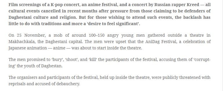 El informe detalla que 100-150 jóvenes se presentaron en el teatro reservado para celebrar el Festival AniDag y amenazaron con matar a los asistentes. Se dijo que los hombres habían prometido «disparar» y «matar» a los fans por supuestamente «corromper» a la juventud de Daghestan.