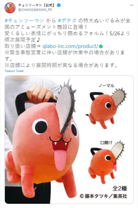 Mediante su cuenta de Twitter oficial del manga Chainsaw Man, se publicรณ un espectacular peluche del demonio de la sierra Pochita. Este peluche esta programado para ser un nuevo premio para las salas de juego y los centros de entretenimiento en Japรณn. Este premio serรก distribuido por las compaรฑรญas Lian Q Labo y Tamaki Co., Ltd.