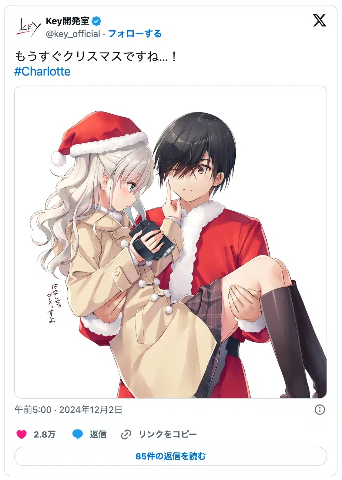 Por medio de su cuenta oficial en ยซXยป, el importante estudio desarrollador de novelas visuales fundado por Jun Maeda, llamado ยซKeyยป (Key Visual Arts) publico esta imagen con temรกtica navideรฑa de Nao Tomori y Yuu Otosaka protagonistas de la aclamada serie de anime ยซCharlotteยป, y en donde dan inicio a la cuenta regresiva para esta tan esperada celebraciรณn tanto en Occidente como en Japรณn.