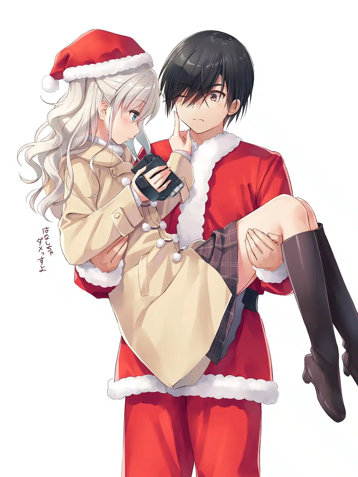 En esta ilustraciรณn vemos a Yuu vistiendo el tradicional y muy reconocible atuendo de Santa Claus, el cual consiste de un abrigo color rojo brillante con unos pequeรฑos detalles de tela blanca acolchada en los bordes, asรญ como unos pantalones del mismo color mientras carga con ambos brazos a Nao.
