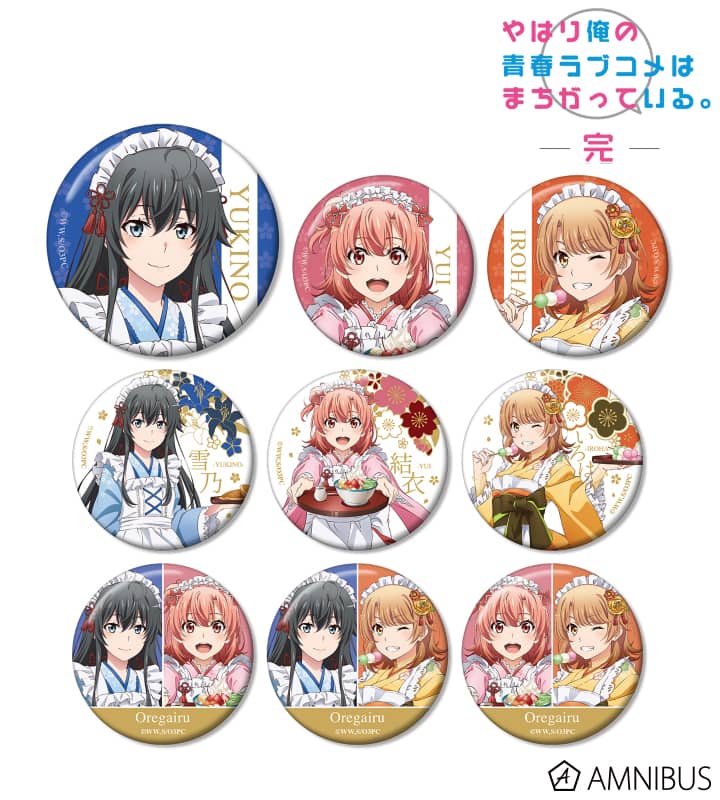 Estos son una serie de nueve pines con distintos diseรฑos inspirados en las ilustraciones especiales de las chicas de Oregairu vestidas de maids, los cuรกles tendrรกn un costo de 400 yenes (3 dรณlares aprox.) cada uno y tendrรกs la opciรณn de comprarlos todos en un bundle por 3.600 yenes (31 dรณlares aprox.).