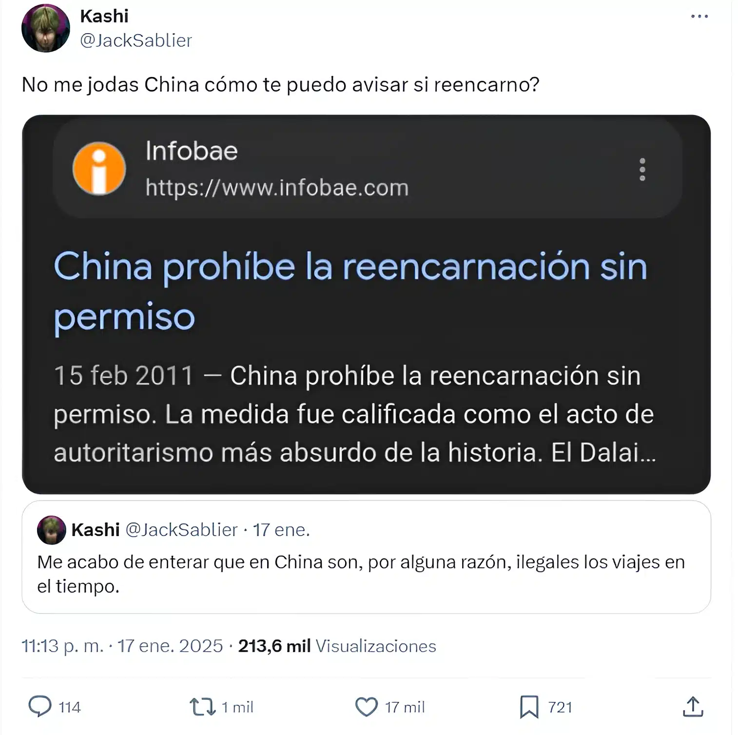 Esta noticia fue compartida por el usuario de X, Kashi (@JackSablier), y aparentemente ha llamado la atenciรณn del pรบblico otaku, quienes han empezado a hablar sobre la reencarnaciรณn y lo han relacionado tanto con los animes de gรฉnero isekai y los manwhas que cuentan este tipo de historias.