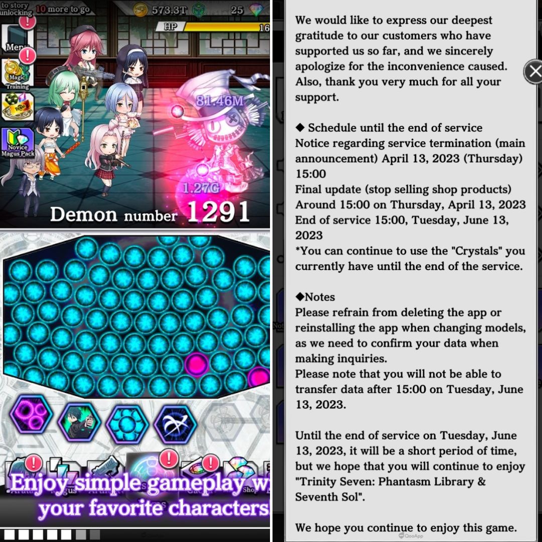 «Muchas gracias por jugar a Trinity Seven: Phantasm Library and Seventh Sol. Lamentamos informarles que el servicio (del juego) finalizará a las 15:00 del martes, 13 de junio de 2023»