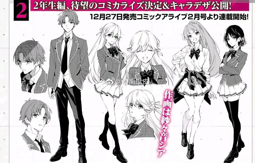 Pues bién, el día ha llegado, y en el sitio web oficial de la revista Monthly Comic Alive anunció de manera oficial que la novela ligera Youkoso Jitsuryoku Shijou Shugi no Kyoushitsu e 2-nensei hen (Classroom of the Elite 2nd Year) tendrá una adaptación a manga. Además, también se ha revelado unos diseños de personajes para esta adaptación.