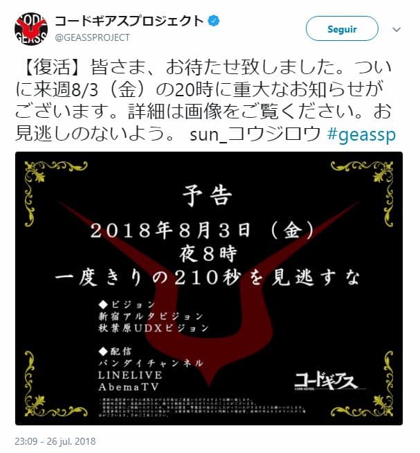 La cuenta de Twitter oficial de la franquiciaย Code Geassย ha revelado que el equipo realizarรก un importante anuncio el dรญaย 3 de agostoย a las 20:00, hora japonesa.