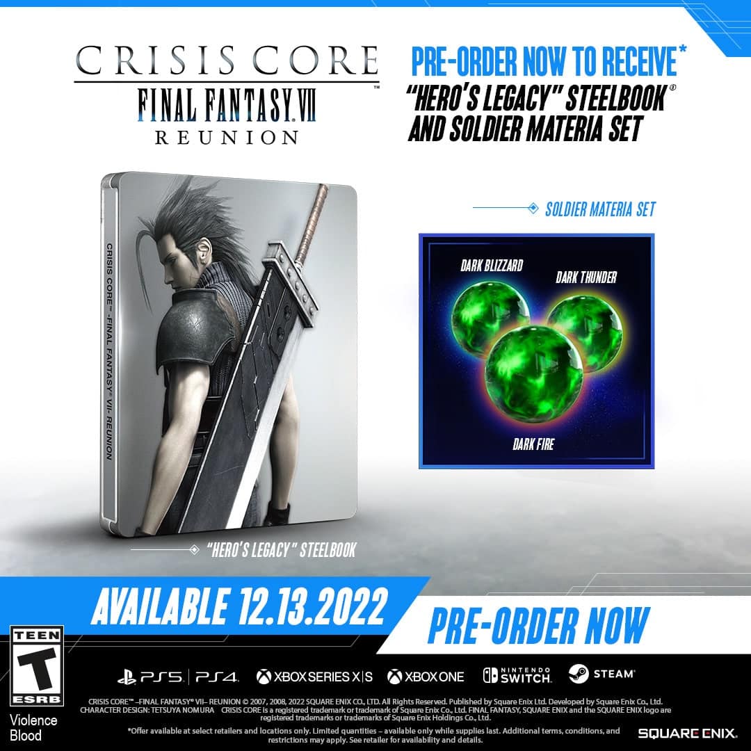 Los fanáticos que realicen pedidos anticipados y compren en la tienda SE recibirán un estuche de acero original con arte del Crisis Core original. Este estuche se puede usar para almacenar CD, discos Blu-ray y otros medios. (NO SE PUEDE usar para almacenar carritos de Nintendo Switch).