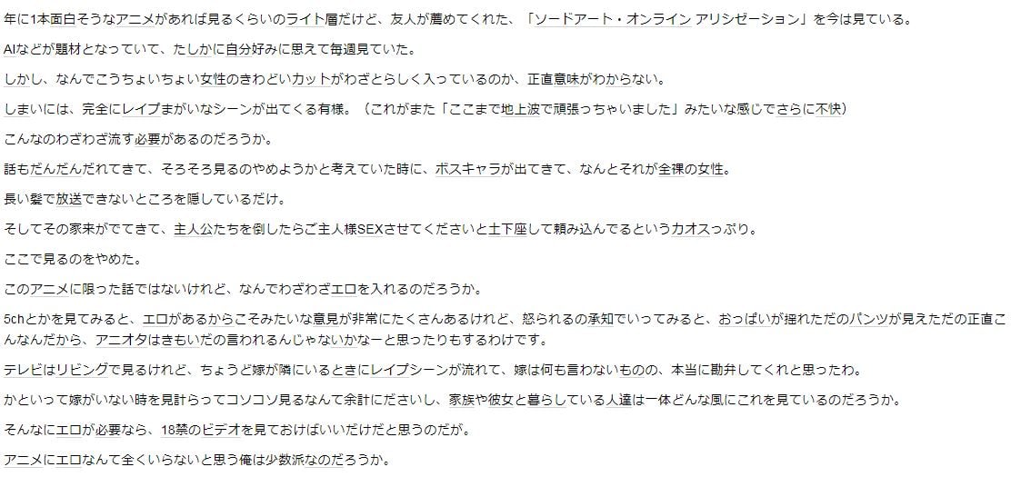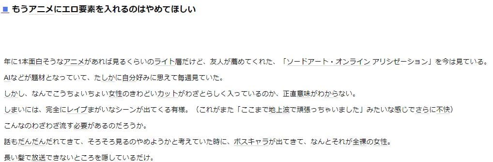 Sin embargo, a medida que avanza la historia aparecen escenas eróticas que según el redactor no son similares a la novela ligera en la que se basa. Describió una escena, la cual podría ser donde Eugeo aparece en los brazos de Administrador, argumenta que se sintió demasiado incomodo por lo que dejo de ver el anime. Al final aclara que esto fue comento por un japonés, llamado Keisuke Ishikawa.