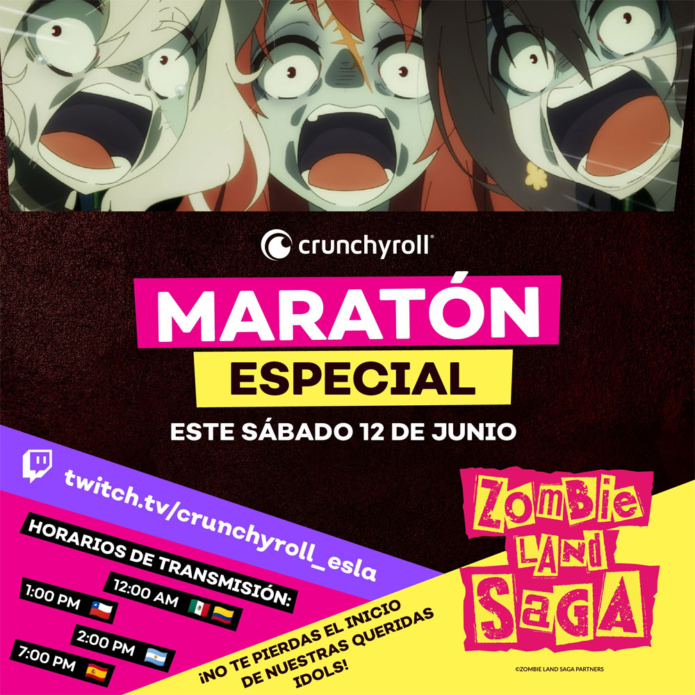 A través de sus redes sociales, Crunchyroll anunció hace unas horas que realizará una maratón del anime Zombie Land Saga el próximo 12 de junio (Sabado) a través de su canal de Twitch Oficial. La maratón comenzará a las 12:00 PM – MEX / COL / 13:00 PM – CHL / 14:00 PM – ARG / 19:00 PM – ESP