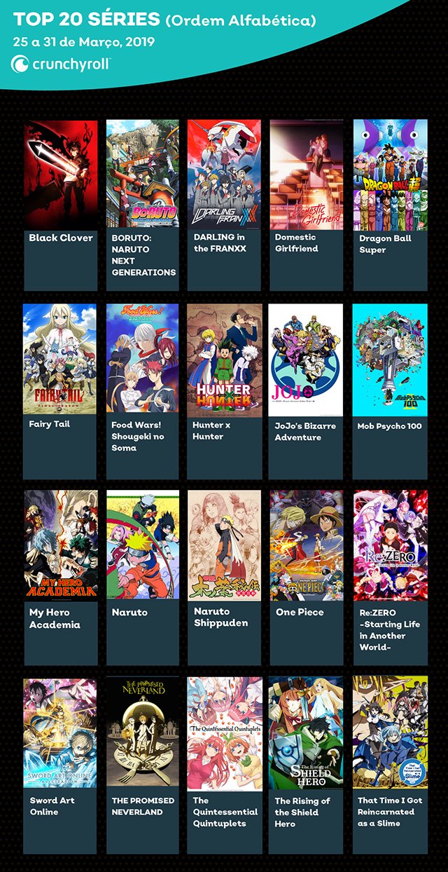 Crunchyroll acaba de publicar una lista en las que podemos apreciar los 20 animes mas vistos del 25 al 31 de marzo. La lista tiene un orden alfabético y no especifica el orden jerárquico de los animes mas visto.