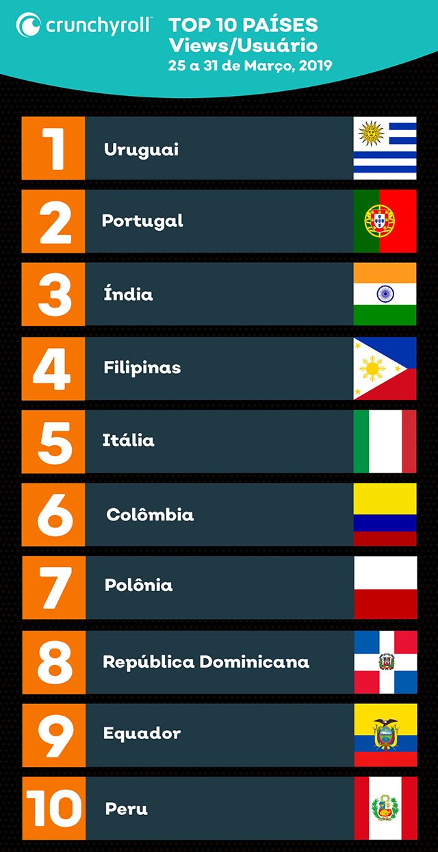 También revelo una lista en la que se aprecia los 10 países en los que hubieron mas animes vistos por usuario. La lista corresponde al mismo periodo del 25 al 31 de marzo.